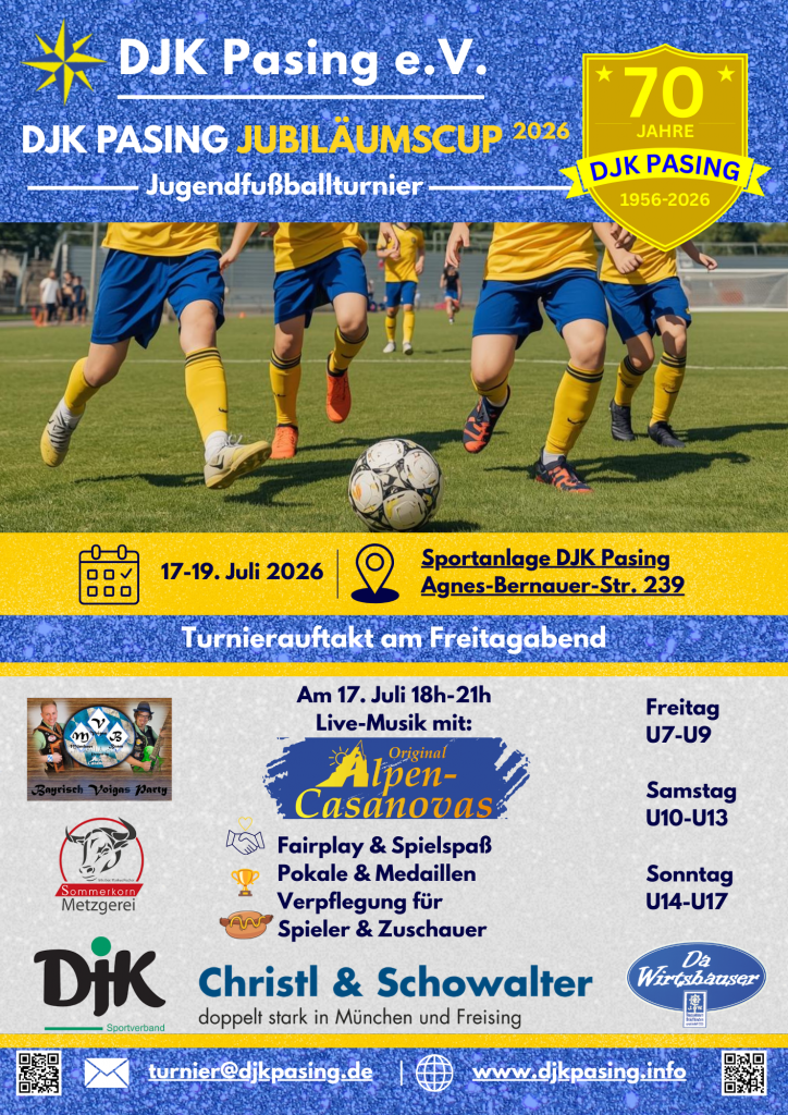 Unser Turnier ist ein fester Bestandteil des Vereinslebens der DJK Pasing und jedes Jahr ein echtes Highlight für Spielerinnen und Spieler, Trainer, Eltern und Zuschauer. Für das leibliche Wohl ist selbstverständlich wieder bestens gesorgt.